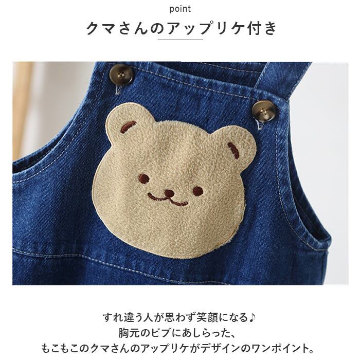 ・すれ違う人が思わず笑顔になる♪胸元のビブにあしらった、もこもこのクマさんのアップリケがデザインのワンポイント。