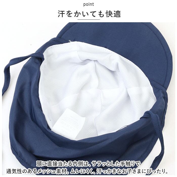 ・頭に直接当たる内側は、サラッとした手触りで通気性のあるメッシュ素材。ムレにくく、汗っかきなお子さまにぴったり。