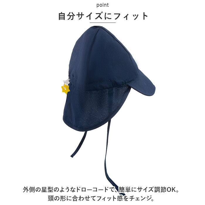 ・縛る位置を調節できるあご紐付き。元気に動き回る日も、風の強い日も大活躍。