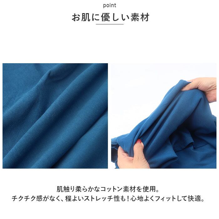 ・肌触り柔らかなコットン素材を使用。チクチク感がなく、程よいストレッチ性も!心地よくフィットして快適。
