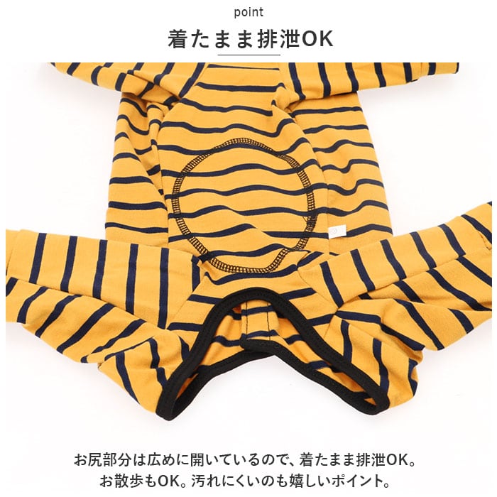 ・お尻部分は広めに開いているので、着たまま排泄OK。お散歩もOK。汚れにくいのも嬉しいポイント。