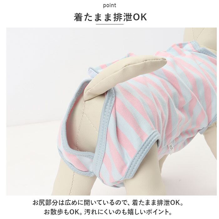 ・お尻部分は広めに開いているので、着たまま排泄OK。お散歩もOK。汚れにくいのも嬉しいポイント。