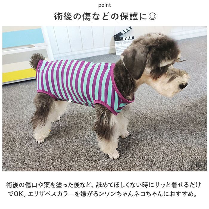 ・術後の傷口や薬を塗った後など、舐めてほしくない時にサッと着せるだけでOK。エリザベスカラーを嫌がるンワンちゃんネコちゃんにおすすめ。