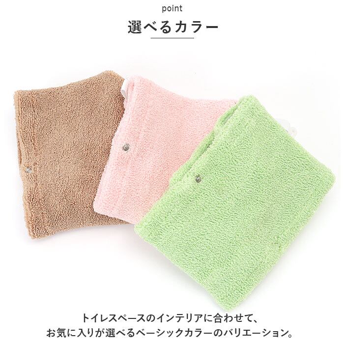 ・便座にカバーをかぶせてスナップボタンを留め、ゴム紐に付いたフックを引っかけるだけ!伸縮性があるのでいろいろなサイズに対応でき、取り付けも簡単。(※洗浄・暖房型便座専用のカバーです。)