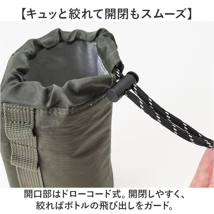 ・開口部はドローコード式。開閉しやすく、絞ればボトルの飛び出しをガード。