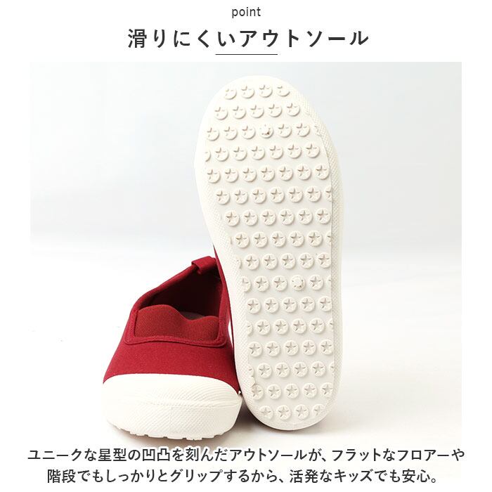 ・ユニークな星型の凹凸を刻んだアウトソールが、フラットなフロアーや階段でもしっかりとグリップするから、活発なキッズでも安心。