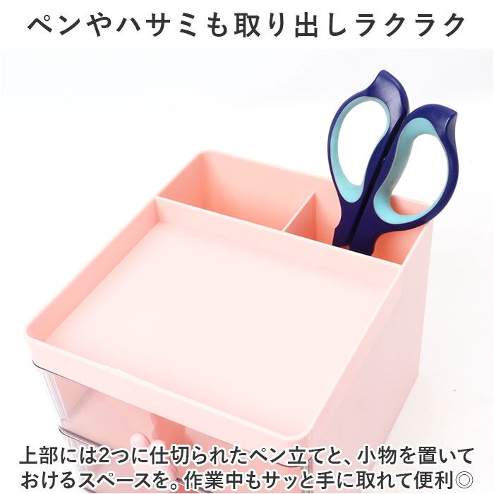 ・上部には2つに仕切られたペン立てと、小物を置いておけるスペースを。作業中もサッと手に取れて便利◎