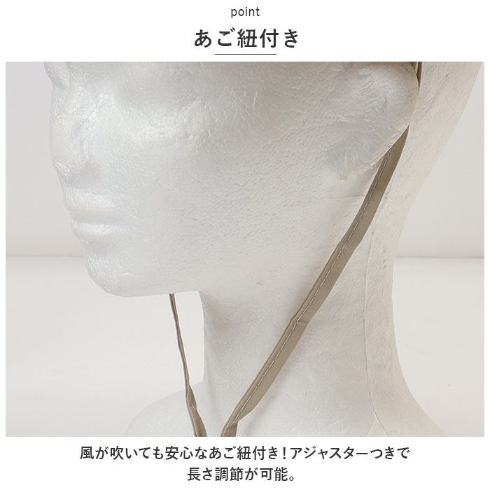 ・風が吹いても安心なあご紐付き!アジャスターつきで、長さ調節が可能。