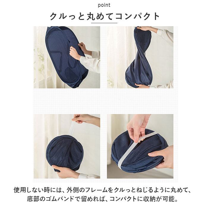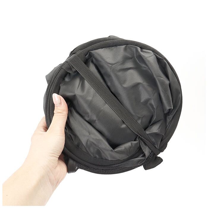 ・使用しない時には、外側のフレームをクルっとねじるように丸めて、底部のゴムバンドで留めれば、コンパクトに収納が可能。