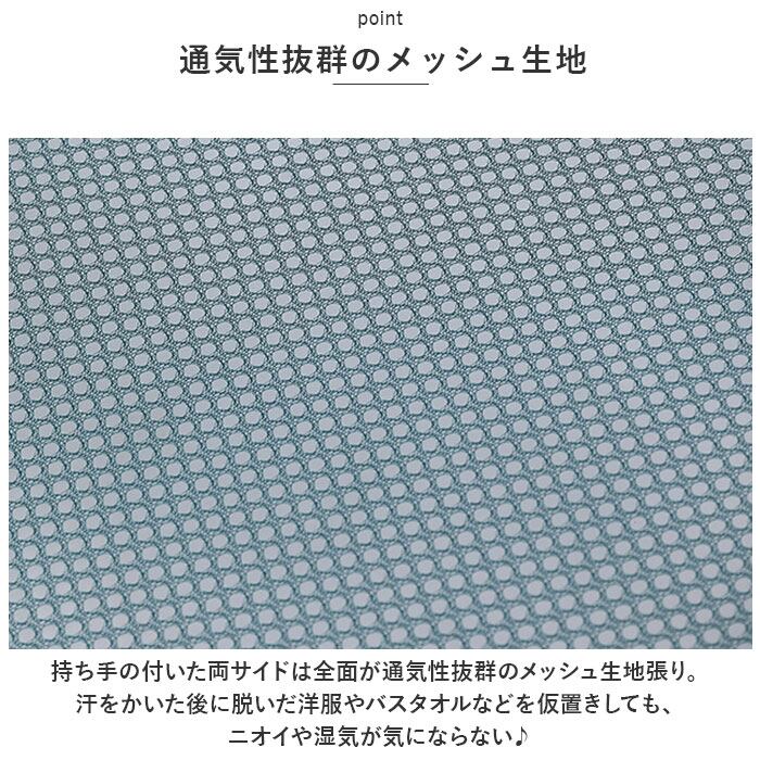 ・持ち手の付いた両サイドは全面が通気性抜群のメッシュ生地張り。汗をかいた後に脱いだ洋服やバスタオルなどを仮置きしても、ニオイや湿気が気にならない♪