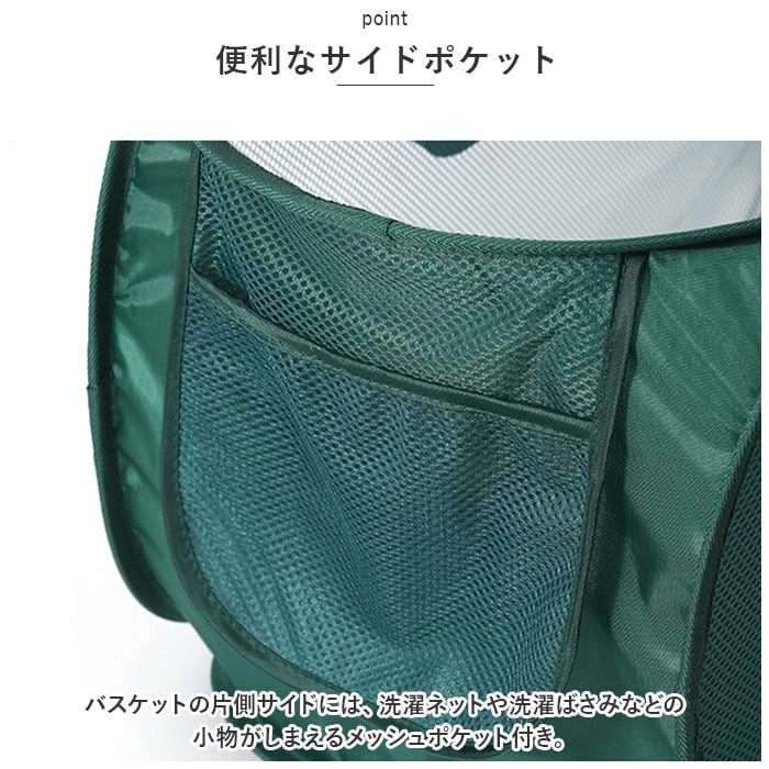 ・バスケットの片側サイドには、洗濯ネットや洗濯ばさみなどの小物がしまえるメッシュポケット付き。