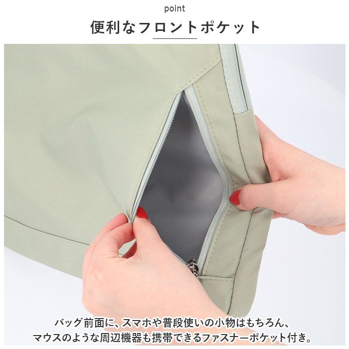 ・バッグ前面に、スマホや普段使いの小物はもちろん、マウスやUSBケーブルのような周辺機器も携帯できるファスナーポケット付き。