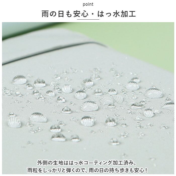 ・外側の生地ははっ水コーティング加工済み。雨粒をしっかりと弾くので、雨の日の持ち歩きも安心!