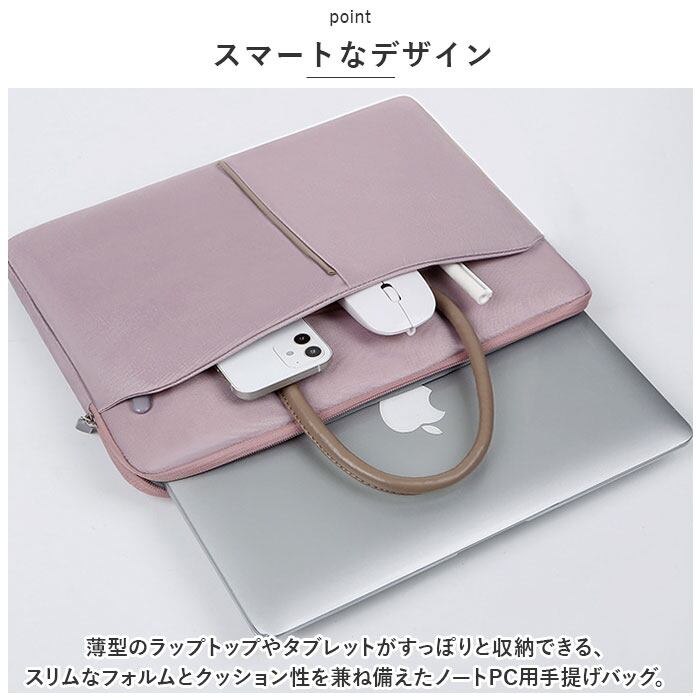 ・薄型のラップトップやタブレットがすっぽりと収納できる、スリムなフォルムとクッション性を兼ね備えたノートPC用手提げバッグ。