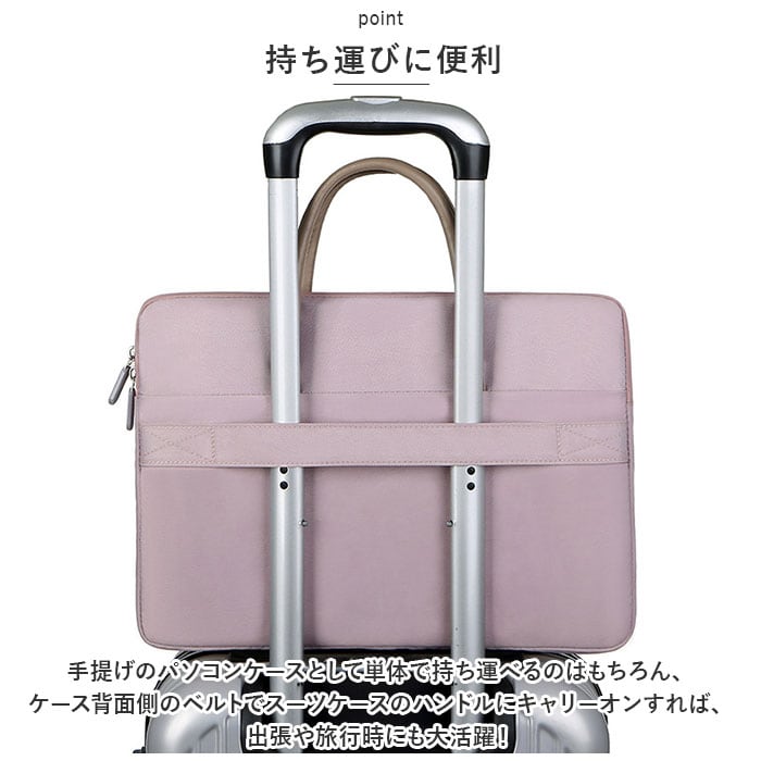 ・手提げのパソコンケースとして単体で持ち運べるのはもちろん、ケース背面側のベルトでスーツケースのハンドルにキャリーオンすれば、出張や旅行時にも大活躍!
