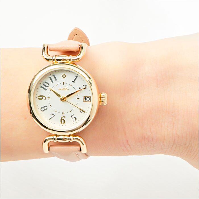 ・ゴールド&シルバーカラーの数字や、12時の位置に配置されたストーンがキラッと輝く☆文字盤ケース横のつまみで、簡単に時刻調節が可能。