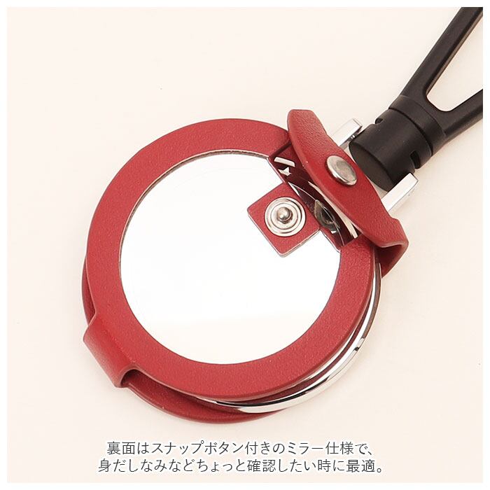 ・裏面はスナップボタン付きのミラー仕様で、身だしなみなどちょっと確認したい時に最適。