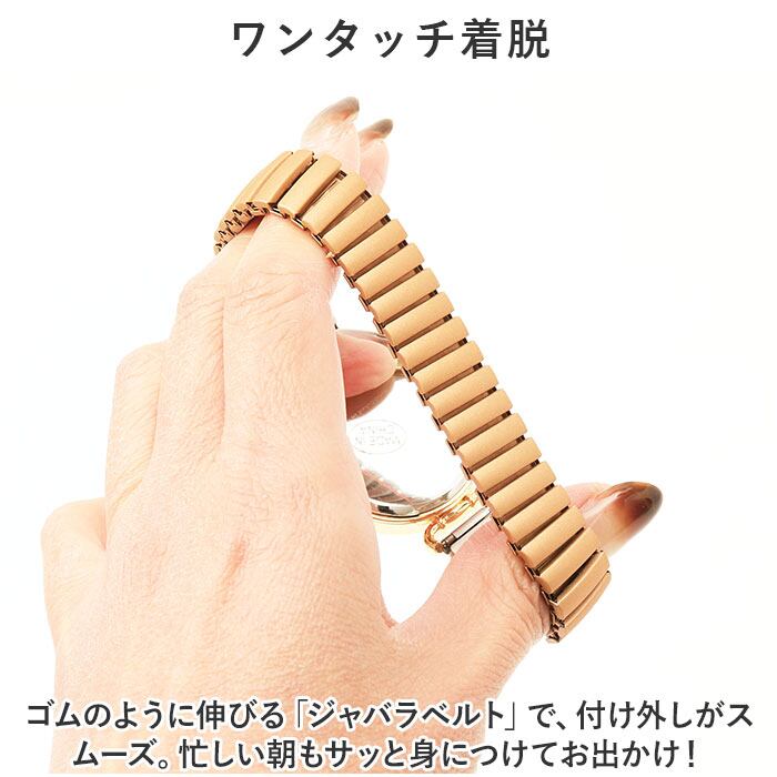 ・ゴムのように伸びる「ジャバラベルト」で、付け外しがスムーズ。忙しい朝もサッと身につけてお出かけ!