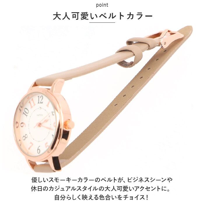 ・優しいスモーキーカラーのベルトが、ビジネスシーンや休日のカジュアルスタイルの大人可愛いアクセントに。自分らしく映える色合いをチョイス!