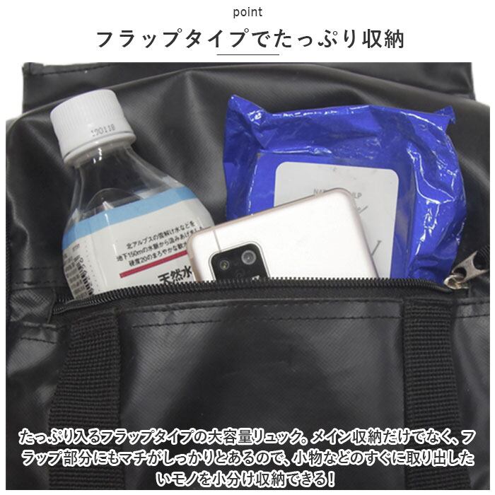 ・たっぷり入るフラップタイプの大容量リュック。メイン収納だけでなく、フラップ部分にもマチがしっかりとあるので、小物などのすぐに取り出したいモノを小分け収納できる!