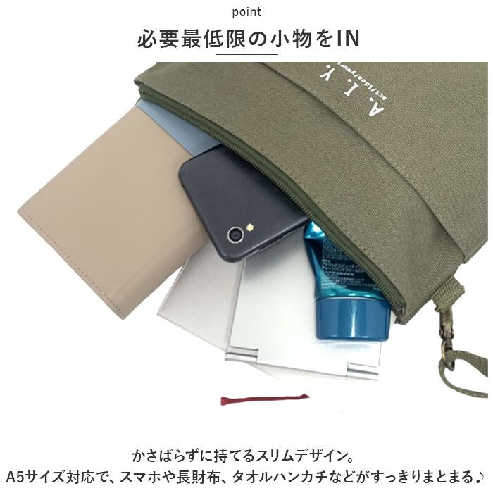 ・かさばらずに持てるスリムデザイン。A5サイズ対応で、スマホや長財布、タオルハンカチなどがすっきりまとまる♪