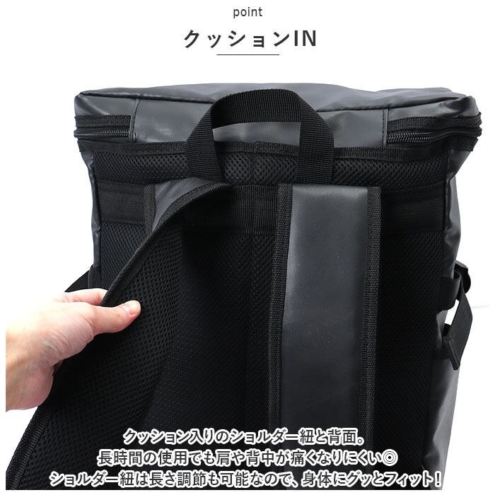 ・たっぷり入るスクエア型のリュック。デッドスペースを軽減し、ファイルや書類、PCなどをキレイに収納できる。お出かけに必要なものをザクザク収納!
