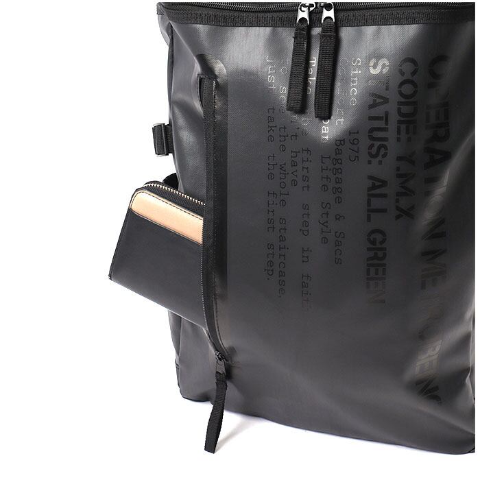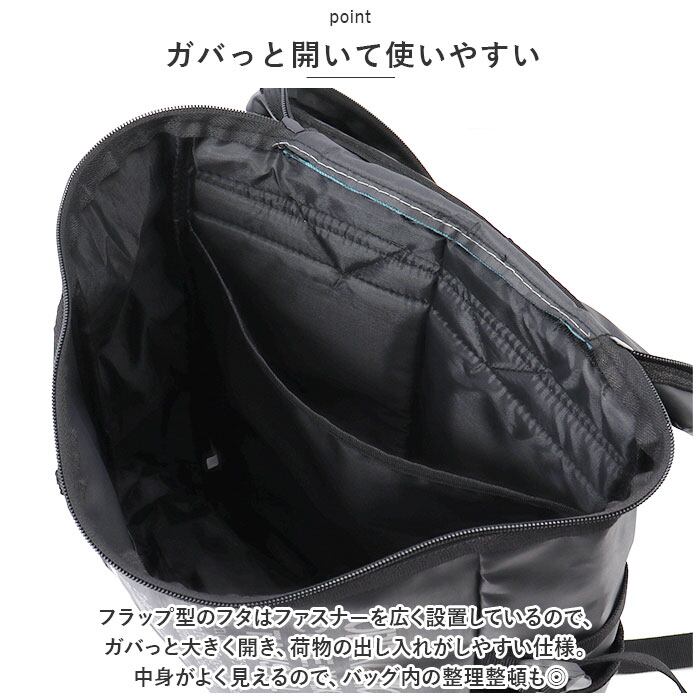 ・フラップ型のフタはファスナーを広く設置しているので、ガバっと大きく開き、荷物の出し入れがしやすい仕様。中身がよく見えるので、バッグ内の整理整頓も◎