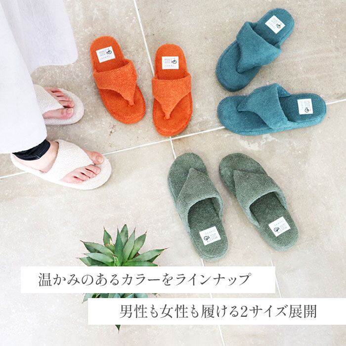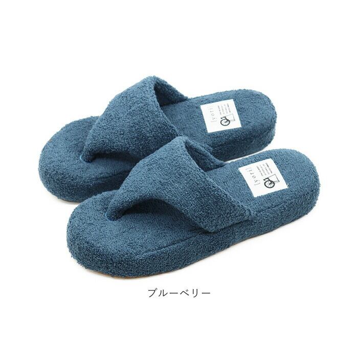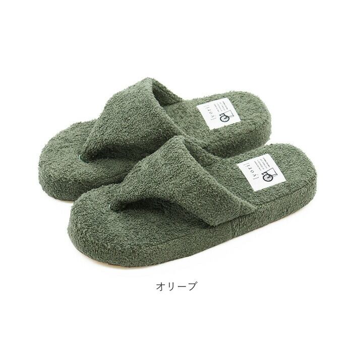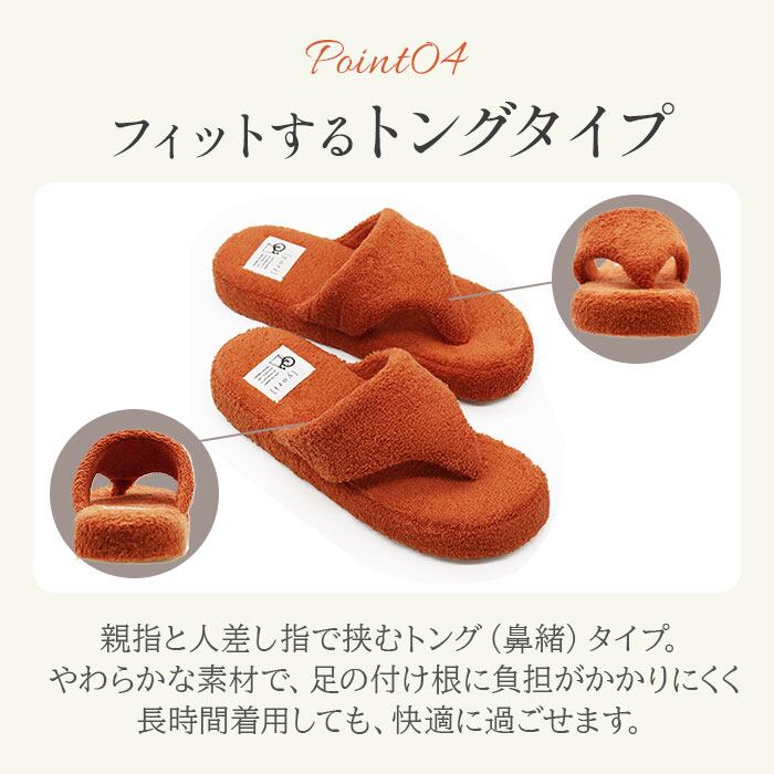 ・足の文指と人差し指でトング(鼻緒)を挟む形状。柔らかなパイル素材だから、付け根の部分が痛くなりにくく、長時間の使用もストレスフリー◎