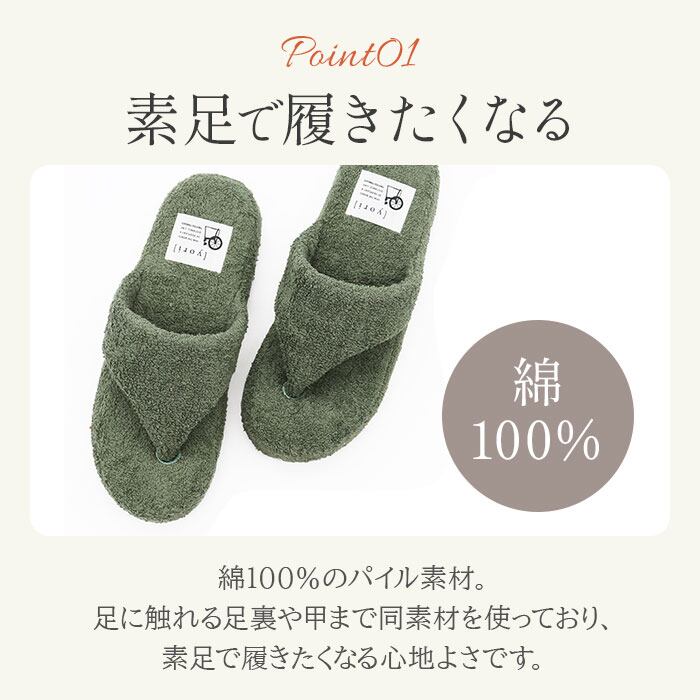 ・綿100%のパイル素材。足に触れる足裏や甲まで同素材を使っており、素足に優しい質感が魅力。