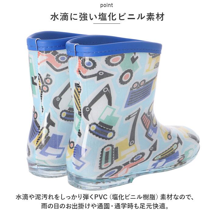 ・水滴や泥汚れをしっかり弾くPVC(塩化ビニル樹脂)素材なので、雨の日のお出掛けや通園・通学時も足元快適。