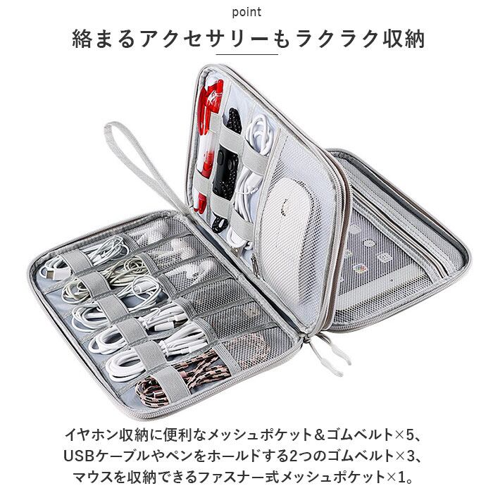 ・イヤホン収納に便利なメッシュポケット&ゴムベルト×5、USBケーブルやペンをホールドする2つのゴムベルト×3、マウスを収納できるファスナー式メッシュポケット×1。