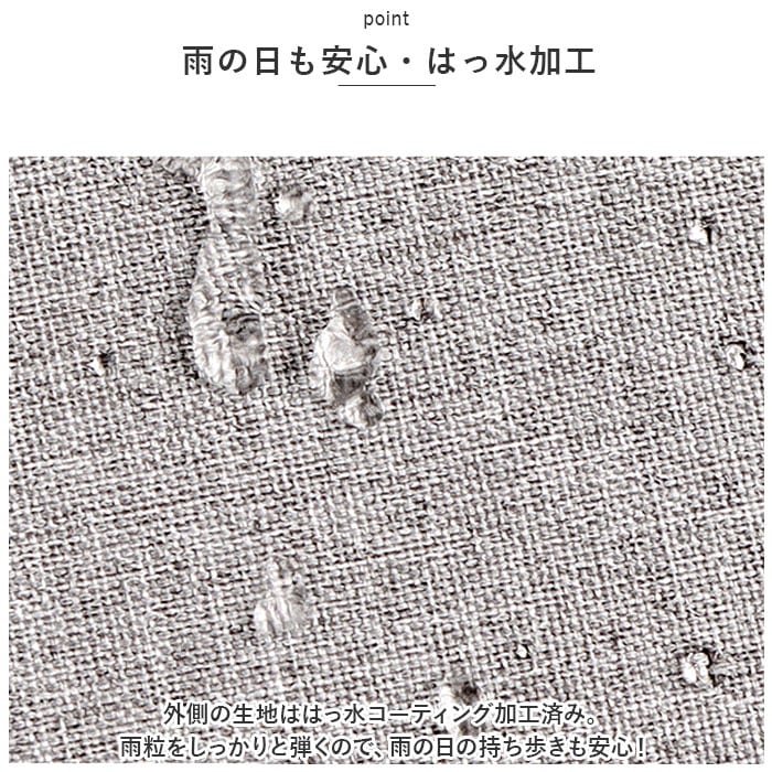 ・外側の生地ははっ水コーティング加工済み。雨粒をしっかりと弾くので、雨の日の持ち歩きも安心!