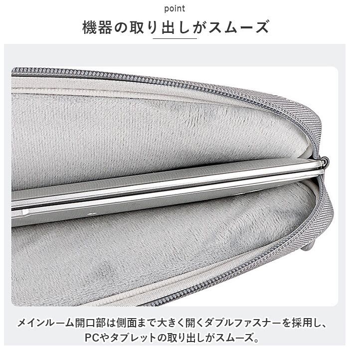 ・メインルーム内側は、肉厚なクッション表面をベルベット調の起毛生地で仕上げ、PC本体やタブレットの液晶画面を優しく保護。