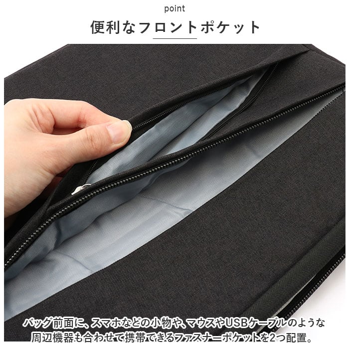 ・バッグ前面に、スマホなどの小物や、マウスやUSBケーブルのような周辺機器も合わせて携帯できるファスナーポケットを2つ配置。