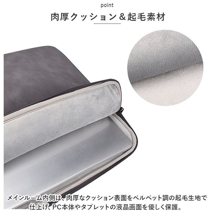 ・メインルーム内側は、肉厚なクッション表面をベルベット調の起毛生地で仕上げ、PC本体やタブレットの液晶画面を優しく保護。