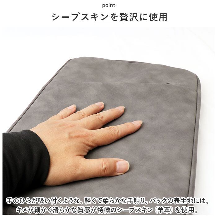 ・手のひらが吸い付くような、軽くて柔らかな手触り。バックの表生地には、キメが細かく滑らかな質感が特徴のシープスキン(羊革)を使用。