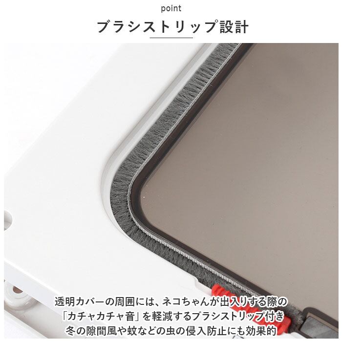 ・透明カバーの周囲には、ネコちゃんが出入りする際の「カチャカチャ音」を軽減するブラシストリップ付き。冬の隙間風や蚊などの虫の侵入防止にも効果的。