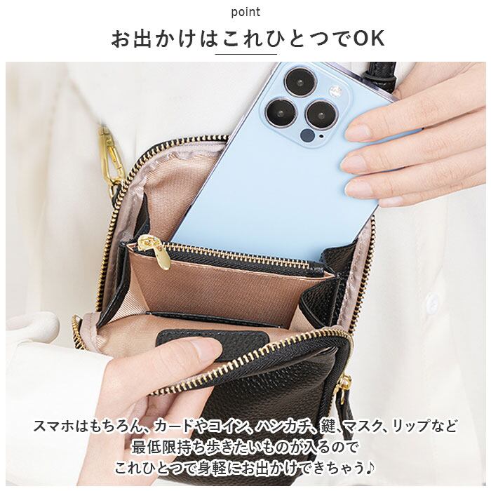 ・スマホはもちろん、カードやコイン、ハンカチ、鍵、マスク、リップなど最低限持ち歩きたいものが入るのでこれひとつで身軽にお出かけできちゃう♪