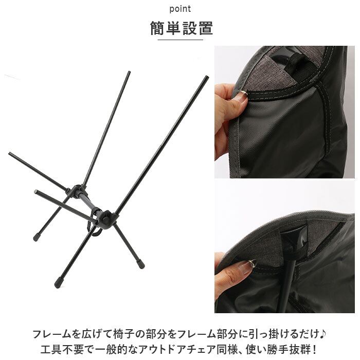 ・フレームを広げて椅子の部分をフレーム部分に引っ掛けるだけ♪工具不要で一般的なアウトドアチェア同様、使い勝手抜群!