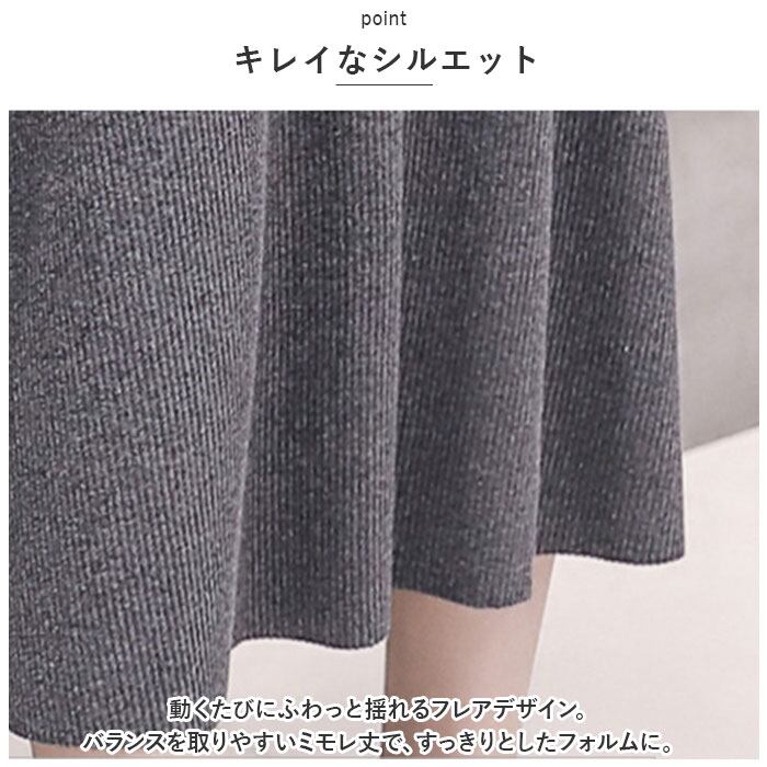 ・動くたびにふわっと揺れるフレアデザイン。バランスを取りやすいミモレ丈で、すっきりとしたフォルムに。