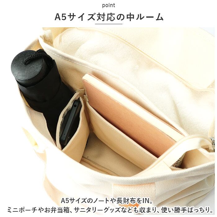 ・A5サイズのノートや長財布をIN。ミニポーチやお弁当箱、サニタリーグッズなども収まり、使い勝手ばっちり。