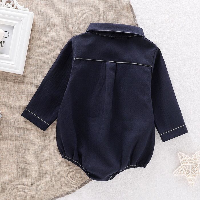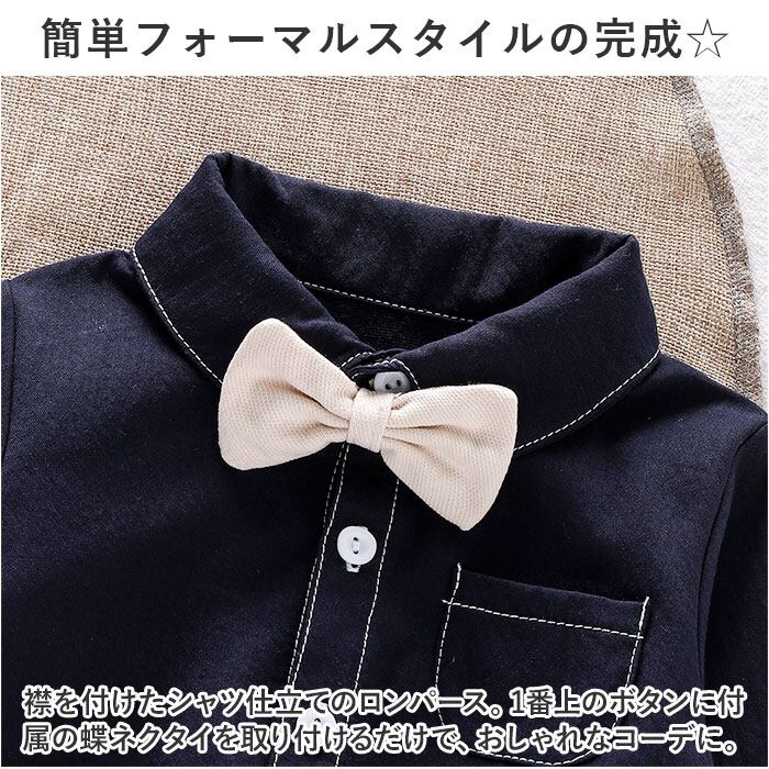 ・襟を付けたシャツ仕立てのロンパース。1番上のボタンに付属の蝶ネクタイを取り付けるだけで、おしゃれなコーデに。