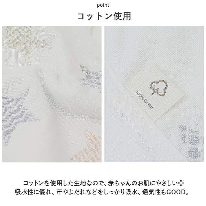 ・コットンを使用した生地なので、赤ちゃんのお肌にやさしい◎吸水性に優れ、汗やよだれなどをしっかり吸水、通気性もGOOD。