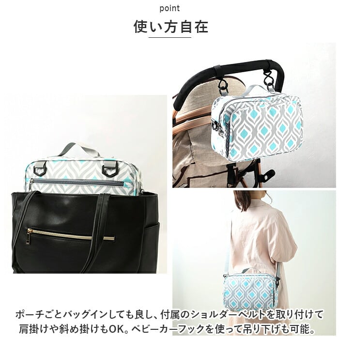 ・ポーチごとバッグインしても良し、付属のショルダーベルトを取り付けて肩掛けや斜め掛けもOK。ベビーカーフックを使って吊り下げも可能。