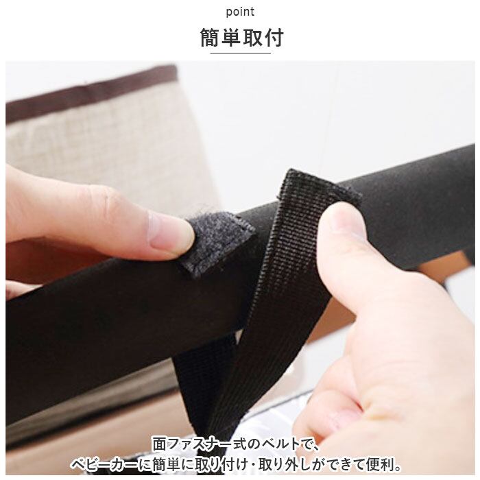 ・面ファスナー式のベルトで、ベビーカーに簡単に取り付け・取り外しができて便利。