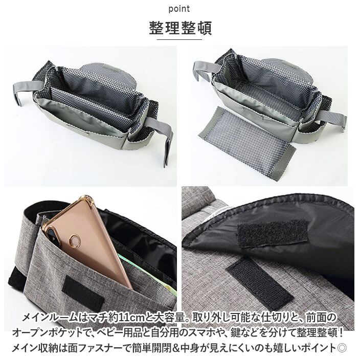 ・メインルームはマチ約11cmと大容量。取り外し可能な仕切りと、前面のオープンポケットで、ベビー用品と自分用のスマホや、鍵などを分けて整理整頓!メイン収納は面ファスナーで簡単開閉&中身が見えにくいのも嬉しいポイント◎