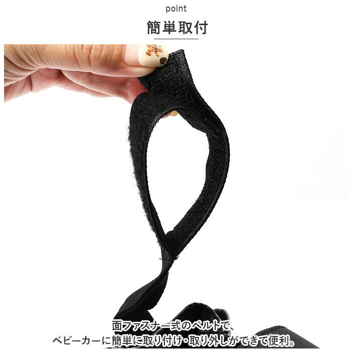 ・面ファスナー式のベルトで、ベビーカーに簡単に取り付け・取り外しができて便利。