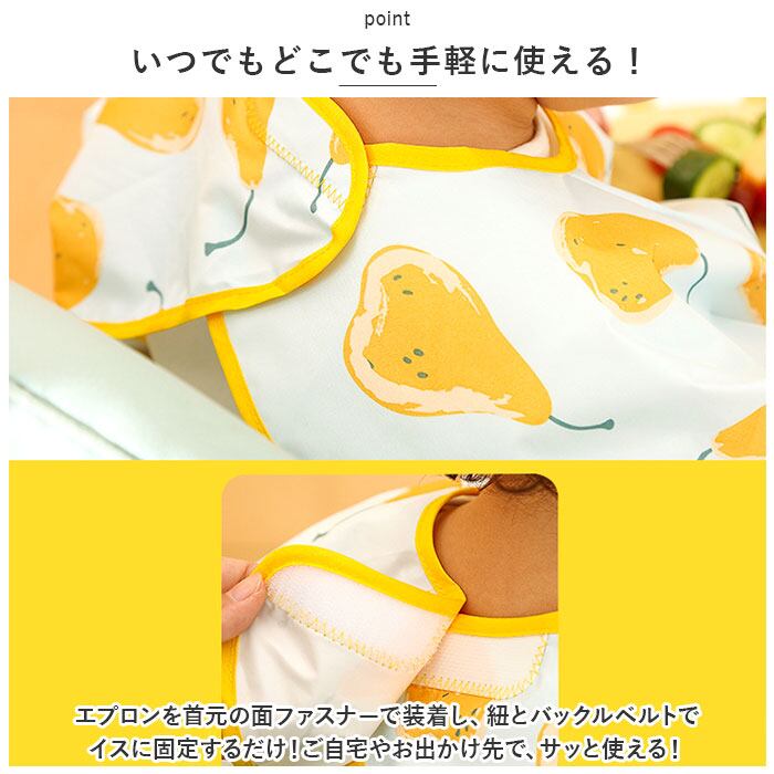 ・エプロンを首元の面ファスナーで装着し、紐とバックルベルトでイスに固定するだけ!ご自宅やお出かけ先で、サッと使える!