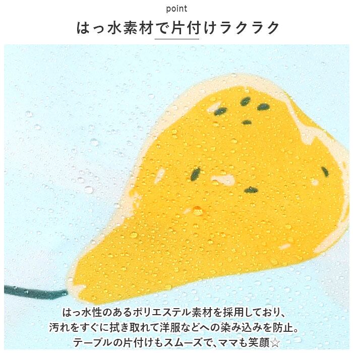 ・はっ水性のあるポリエステル素材を採用しており、汚れをすぐに拭き取れて洋服などへの染み込みを防止。テーブルの片付けもスムーズで、ママも笑顔☆