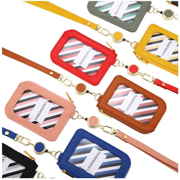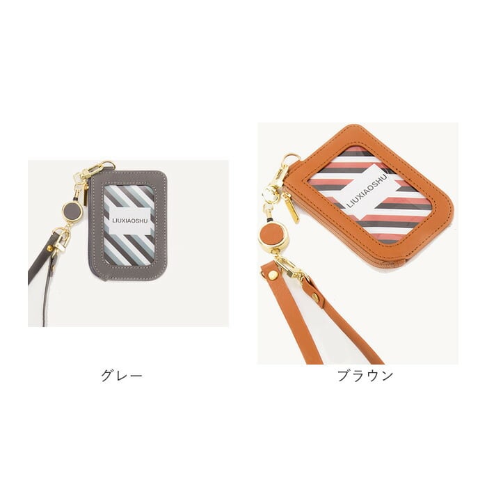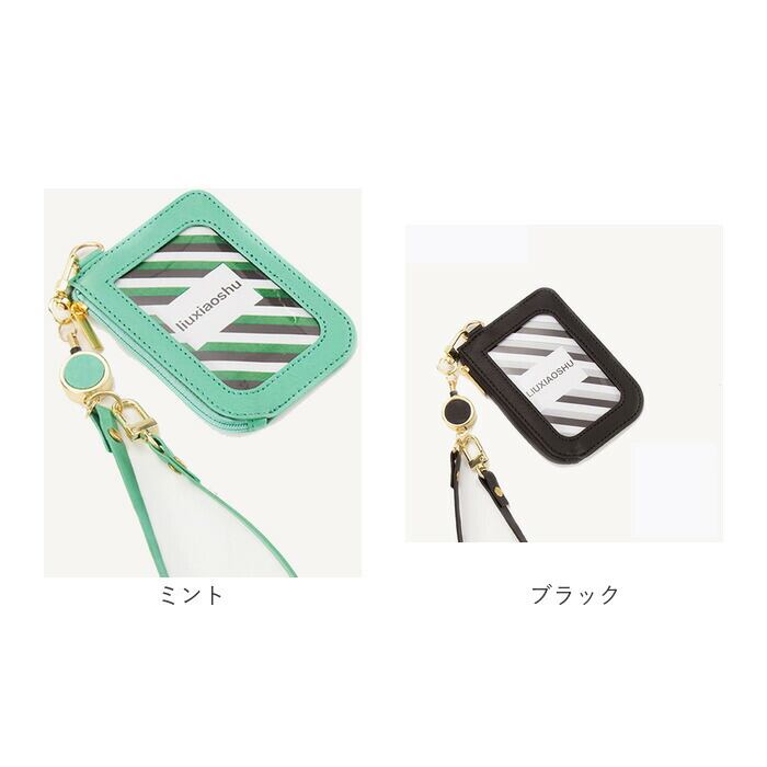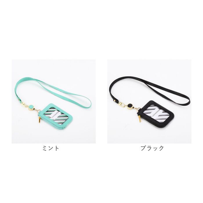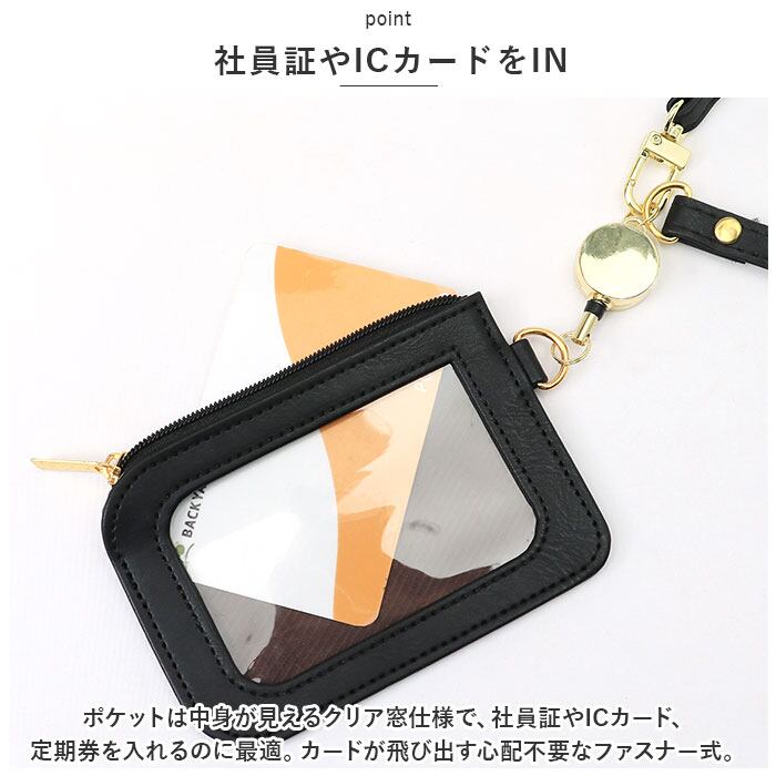 ・ポケットは中身が見えるクリア窓仕様で、社員証やICカード、定期券を入れるのに最適。カードが飛び出す心配不要なファスナー式。